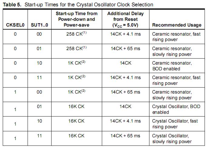 В таблице 2 указаны комбинации фьюзов для разных источников тактового сигнала. Далее написано что с завода МК поставляется с такой комбинацией фьюзов