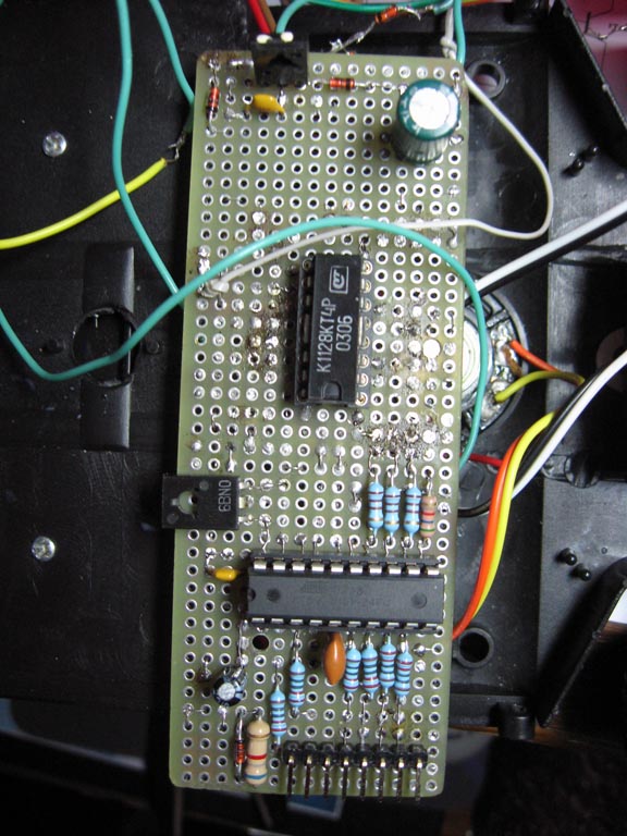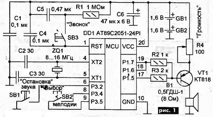На резисторах R2, R3 выполнен смеситель сигналов основной (линия Р1.7) и вдвое меньшей (линия Р1.5) частоты. Суммарное двухоктавное звучание напоминает аккордеон. Изменить окраску тембра можно подбором сопротивления резистора R3 в пределах 1...3 кОм. Линия Р1.6 работает кок вход. Она служит для проверки состояния линии Р1.7 и дальнейшего программного деления частоты на 2...