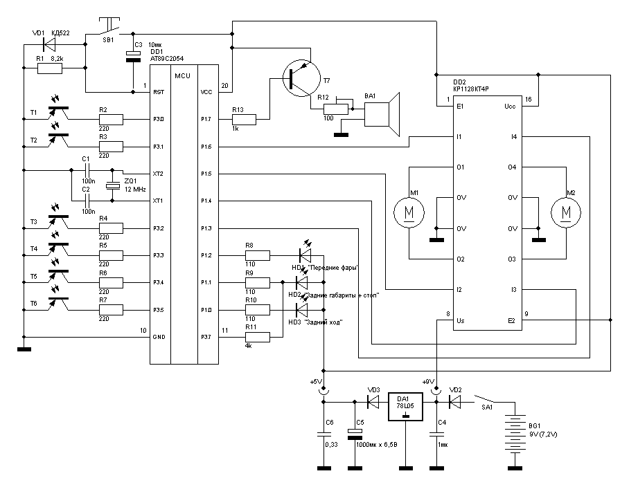 vj-nike писал(а):Дайте, пжалста, вами проверенные схемы подключения к 9В акк. МК, L293 и моторчиков.
