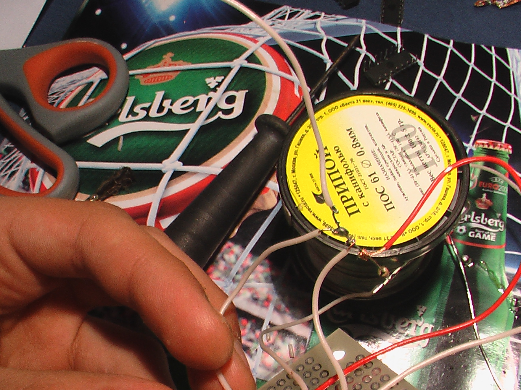 Вот чо я натворил с разных ракурсов.Два белых проводка - "+" и "-". Если кто чо поймёт ПОМОГИТЕ. Заранее спасибо