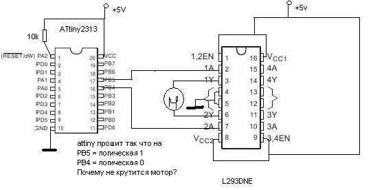 Далее, вывод 2 отключаем от минуса, и через резистор ~1 ком подключаем к питанию (+5 в), двигатель должен заработать.
