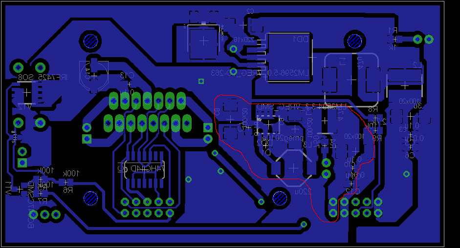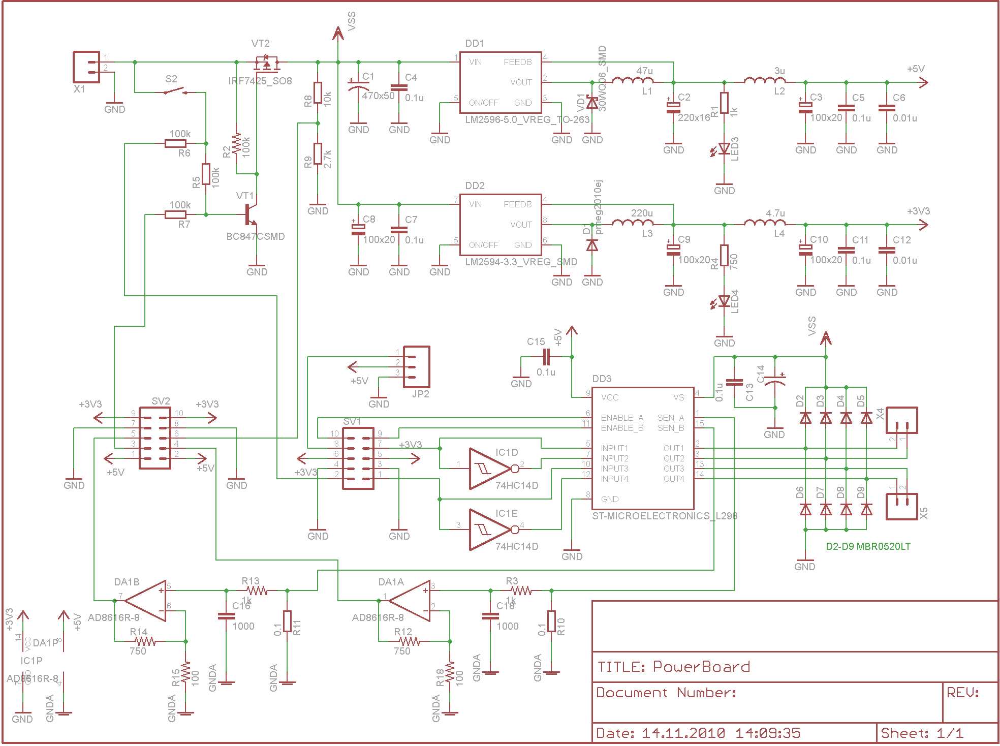 Прошу помочь понять в чем проблема, сделал плату для питания своего робота, с выходами 5В на микросхеме DC-DC LM-2596 и 3.3В на LM-2594 (схему прикрепил, и на всякий случай разводку и в архиве проект в eagle). Входное напряжение 12В (3s LiPo), максимальный ток нагрузки по линии 3.3В ~100ма. При подключении нагрузки на линию 3.3 В напряжение на ней значительно просаживается: если подключить один микроконтроллер, то до 3.25В, если подключить остальные устройства с общим потреблением около 100 ма, напряжение просаживается до ~2.3В. Схему делал по даташиту. Сначала правда индуктивность поставил 100 мкГн, так при нагрузке напряжение пульсировало с периодом около секунды. Поставил 220 мкГн - пульсировать перестало, но все равно проседает.