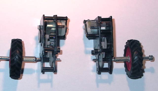 3 - из редухтора, образно говоря, торчат 2 вала - обзовём их условно входом и выходом - тоесть который крутит, и которого крутят... ну и сказанул. Тот вал, что раньше был входом, у нас будет выходом, и наоборот. Так вот, на вход, посредством резинового кембрика, цепляем вал мотора (тут придётся похимичить, чтоб всё срослось), а на выход надеваем колёсико (опять химичить...)