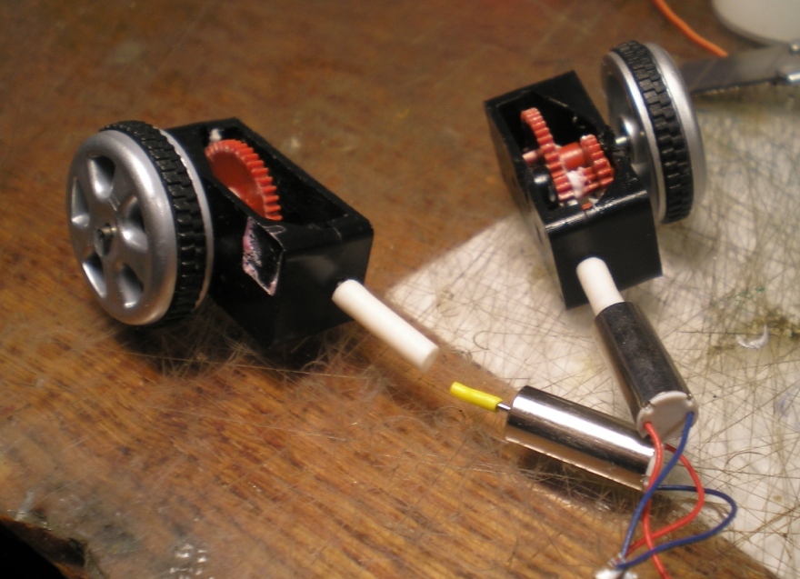 3 - из редухтора, образно говоря, торчат 2 вала - обзовём их условно входом и выходом - тоесть который крутит, и которого крутят... ну и сказанул. Тот вал, что раньше был входом, у нас будет выходом, и наоборот. Так вот, на вход, посредством резинового кембрика, цепляем вал мотора (тут придётся похимичить, чтоб всё срослось), а на выход надеваем колёсико (опять химичить...)
