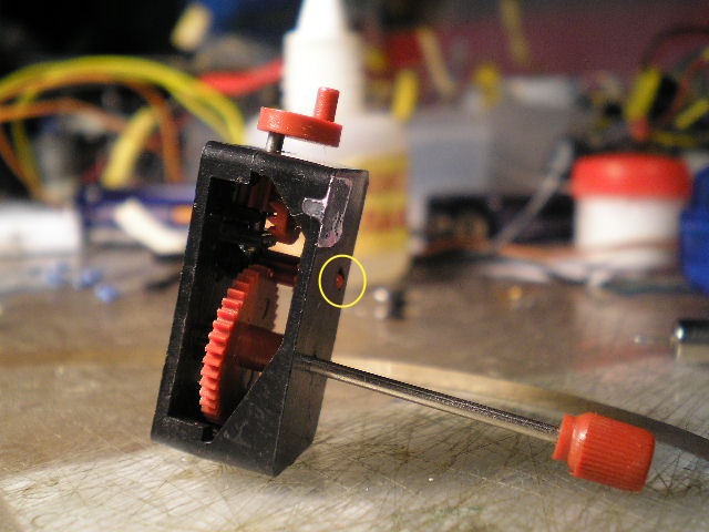 2 - выдераем из редуктора пружинку. Бывает, и часто, что есть унутри маленькая шестерёночка в продольных дырочках - это чтоб она в одну сторону сцеплялась с остальными шестернями, а в другую тока чтоб пружину заводить. Извиняйте за сумбур - это тока в руках сразу понять можно. Нам эта однобокость никчему, и дырочки эти овальные превращаем в круглые, тыкнув им с нужной стороны паялом - теперь та шестерня цепляется с остальными при вращении в любую сторону.