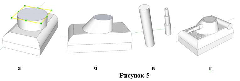Шаг 6. Масштабирование и перемещение. Выделяем верхнюю поверхность башни и выбираем в Tools инструмент Scale (рис. 5а). Таская зелененькие кубики, уменьшаем размер поверхности. Выбрав инструмент Move-Copy (инструмент 11) ставим «крышу» на место (рис. 5б). Используя уже хорошо изученные инструменты, упражняемся в рисовании ствола и прочих радостей рядового танкиста (рис. 5в). Для рисования подобных контуров попробуйте инструмент 13. Детали можно рисовать в сторонке и затем перемещать на общую сцену. Выделение связанных поверхностей (читай отдельных объектов) осуществляется тройным щелчком мыши. Выделенные законченные объекты можно объединять в группы (Make Group в контекстном меню), которые удобно таскать и масштабировать, либо в компоненты (Make Component в контекстном меню), которые можно сохранять и вставлять в другие проекты. При совмещении объектов с пересечением поверхностей для создания разделительных линий нужно в контекстном меню выбрать Intersect-With Model или With Selected. Итог создания простенького корпуса на рис. 5г.