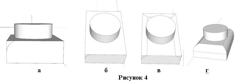 ) поверхности и тащим вверх (высоту также можно ввести с клавиатуры). См. рис. 3а. Этот же инструмент позволяет создавать всякие отверстия. Нарисуйте на верхней поверхности кирпича круг и с помощью Shape протащите поверхность круга до нижней поверхности кирпича (курсор перемещайте до тех пор, пока не появится красненькая точка и надпись On Edge). Получился кирпич с дыркой (рис. 3б). Нажмите Ctrl+Z, чтобы отменить изменения (Ctrl+Y – используется, чтобы вернуть действие) и протащите Shape-ом кружок вверх, чтобы получилась башня (рисунок 3в).Шаг 5. Инструмент Follow Me. Поверните сцену так, чтобы увидеть сцену «сзади» (инструмент 14) и нарисуйте дугу (инструмент 5) на кирпиче (рис. 4а). Поворачиваем сцену, так, чтобы видеть и заднюю часть кирпича и верх (рис. 4б). Выбираем в меню Tools инструмент Follow Me, щелкаем на уголочке, отделенном с помощью дуги, и протаскиваем красную линию по трем сторонам кирпича (кроме задней) (рис. 4в). Вертим к нам передом и смотрим (рис. 4г). Красота!