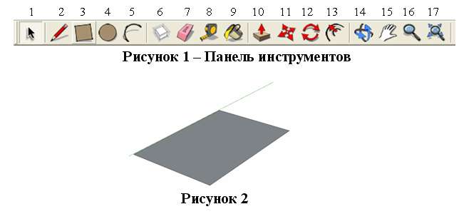. Пункт меню полезен, когда потеряешься в сложной сцене, т.к. здесь можно выбрать какой-нибудь стандартный вид), Draw (для рисования примитивов), Tools (всякие орудия трехмерного труда). Часть команд, как обычно, продублирована кнопками панели инструментов. Часто используемые команды будем кратко разбирать по ходу дела.Шаг 3. Рисование и панель инструментов. На рисунке 1 изображена панель инструментов. Нажимаем кнопку Rectangle (номер 3 на рис. 1).