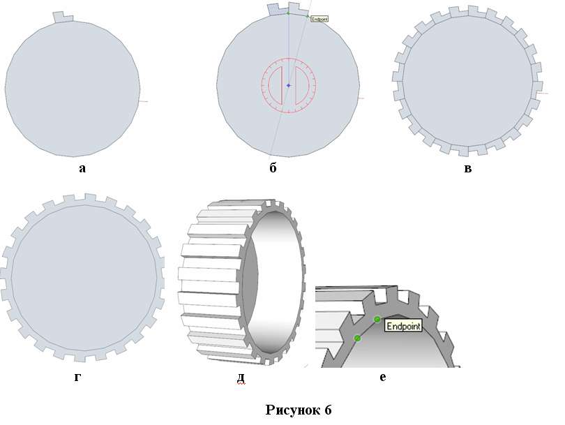 Шаг 7. Поворот и копирование. В сторонке от танка в вертикальной плоскости создаем кружок и дорисовываем ему элемент протектора (для точного совмещения при копировании можно нарисовать внешнюю вспомогательную окружность, которую затем можно убрать), выделяем элемент протектора, выбираем инструмент поворота (инструмент 12) и размещаем как показано на рисунке 6а. Далее нажимаем (без удержания) Ctrl, поворачиваем копируемый элемент протектора и красиво совмещаем рядом (рис. 6б). Далее щелкаем мышкой и на клавиатуре вводим число копируемых элементов с буквой х, например 25х, и нажимаем Enter. Ну разве не прелесть (рис. 6а)? Берем резиночку (инструмент 7), стираем все лишнее внутри круга (рис. 6г) и с помощью инструмента Shape приводим колесо к более-менее удобоваримому виду (рис. 6д). Для того чтобы на внутренней стороне колеса тоже «затянулась» поверхность, нужно инструментом «Линия» нарисовать отрезочек по линии контура (рис. 6е).