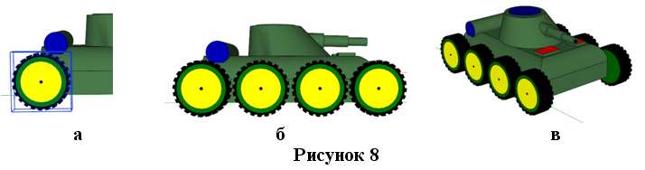 Шаг 9. Снова копирование. Настало время примерять колеса! Изготавливаем из колеса группу и тащим его к танку (рис. 8а)! Н-да… Надо бы побольше присобачить. Делаем четыре копии колеса описанным выше способом (рис. 8б). Что-то подсказывает, что тележка будет хромать, если оставить без колес с другой стороны