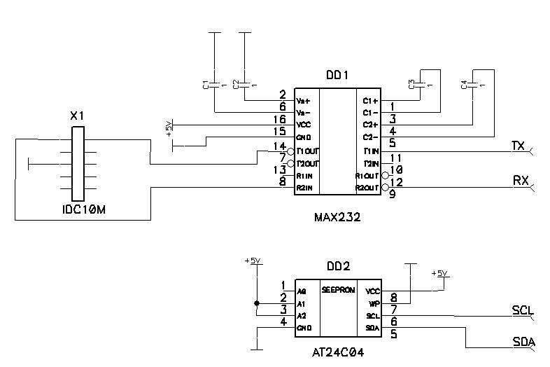 Ниже прилагаю исходник интерфейса и код. По схеме к контроллеру (Tiny2313) подходят следующие сигналы: PORTB.0 = SDA памяти, PORTB.1 = SCL памяти, PORTD.0 = RXD max232, PORTD.1 = TXD max232.