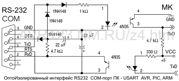 Возникает много вопросов, и наверно возникнет еще больше когда доберусь до программирования. Наверно вопросы возникают не только у меня, а у всех кто хочет соеденить микруху и комп впервые, поэтому решил создать тему, которая как думается, будет полностью описывать аппаратно-программную обвязку AVR-->rs232-->COM. Наверно надо начать с соединения компа к AVR. На своем курсе avr123.nm.ru любезно придоставил схему. вопрос:1. имеет ли значение то, какие ставить диоды и оптопары?