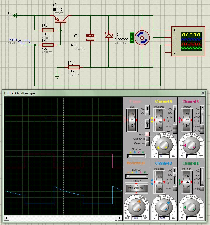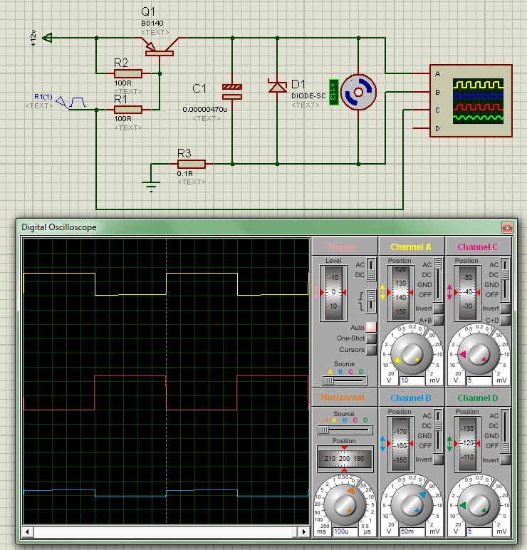 blindman писал(а):В протеусе на осциллографе есть кнопки "A+B" и "Invert". И если прицепить 2 канал к выводам резистора, можно посмотреть напряжение на нём. И неплохо бы мерять в режиме DC