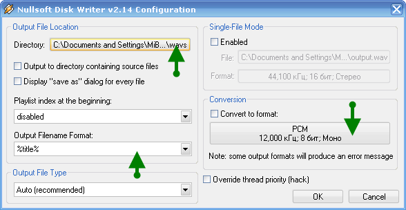 для записи в файл заходим в preferences(ctrl+p)->plugins->output, выбираем Nullsoft Disk Writer в качестве выходного и тыкаем пимпу configure.