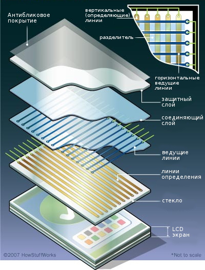 Сенситивная поверхность наносится подобно обыкновенным печатным платам. Она состоит из верхнего изоляционного слоя и сетки дорожек-проводников под ним. Когда палец касается поверхности, он изменяет электрическую ёмкость между соседними дорожками, исходя из чего возможно вычислить его положение и площадь касания.