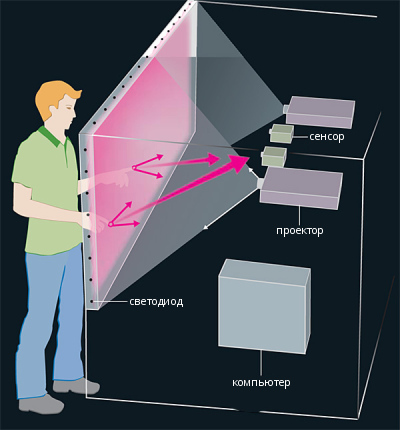 На акриловый экран проецируется изображение, с помощью проекторов, расположенных с противоположной к пользователю стороны. Когда к поверхности прикасается какой-либо объект, свет излучаемый светодиодами, размещёнными по периметру экрана рассеивается в точке соприкосновения и попадает на датчики отражений, при помощи которых, программными методами рассчитывается местоположение точки касания.