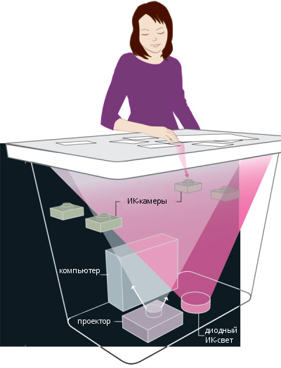 Microsoft Surface использует подобный подход, но источник инфракрасного света расположен рядом с проектором, а преломления распознаются инфракрасными камерами.