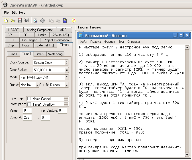 Помогите теперь пожалуйста понять таймеры, очень хочется сделать ШИМ чтобы управлять серво, но пока не понятно как это происходит. Читаю курс AVR123 не могу разобраться,там сразу слишком много информации для начинающего, вчера весь вечер разбирался с битами, что и куда устанавливается, помог только даташит на русском к меге 128. пишу на WIN AVR , поэтому частенько приходится перелопачивать все что нахожу под свой компилятор(не всегда получается, все используют свои библиотеки и макросы. даже не обьявляя их в коде и порой это запутывает до конца). А конкретный вопрос вот в чем, не могли бы вы подсказать алгоритм установки таймера , без кода, а может просто словами (или блок схемой) , и про прерывания и какую роль в них играет таймер (как взаимодействует с ними). КодВизард не кактит, хочется самому втыкнуть как все это работает