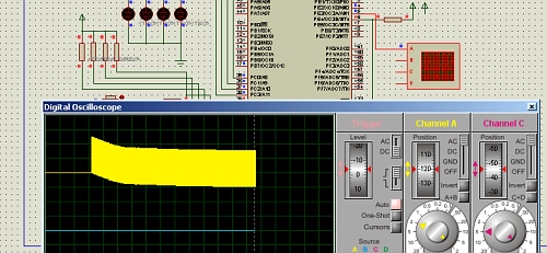 P.S. Proteus в своём осциллографе рисует удивительную динамику: как будто сигнал сначала колеблется от 0 до 5в. а потом плавно сползает вниз. Это глюки осциллографа Proteus'a или я чего-то накрутил и получаю отрицательное напряжение? о_О