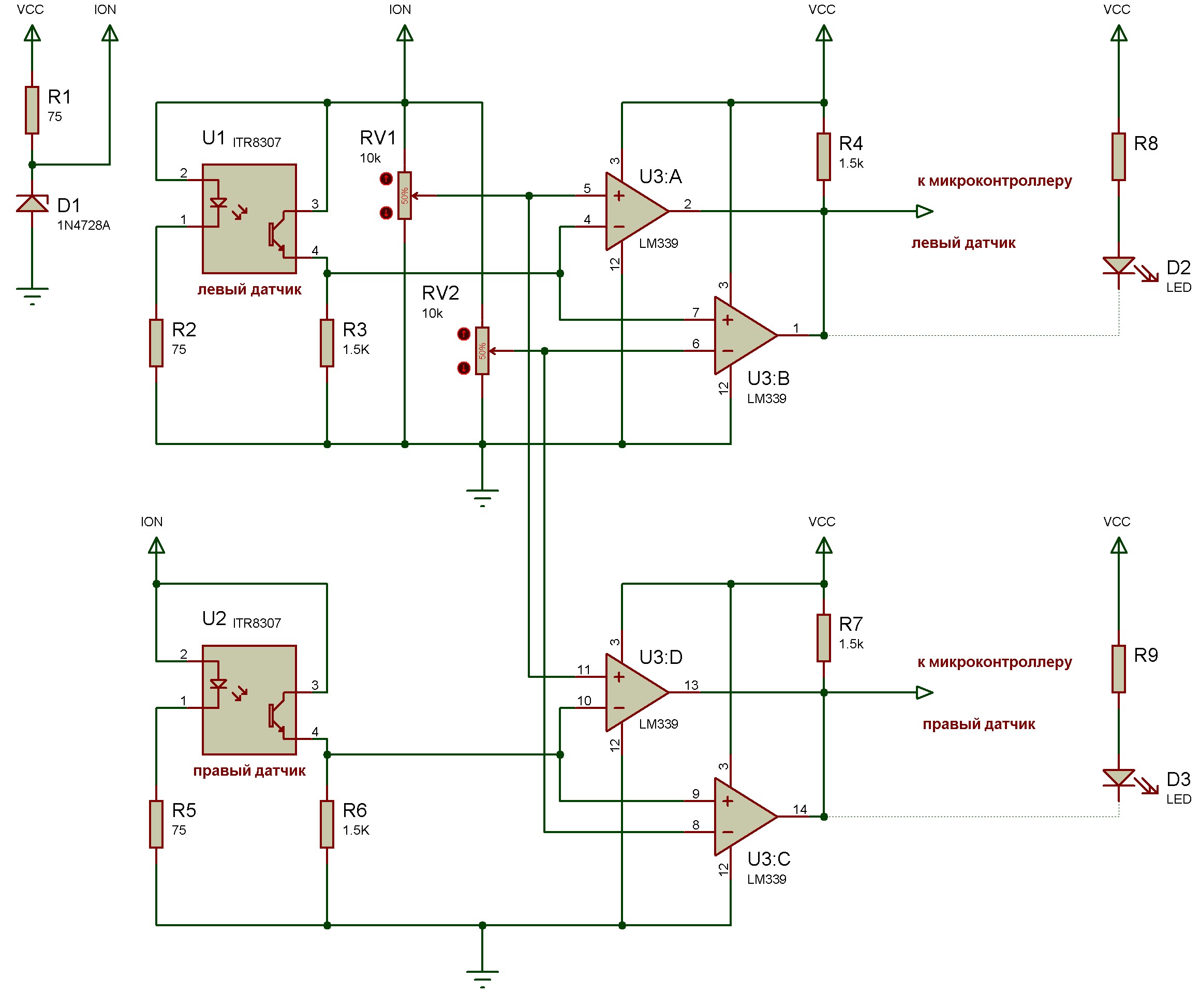 Оптопара на отражение - ITR8307, компаратор - счетвереный LM339, по два компаратора на датчик.