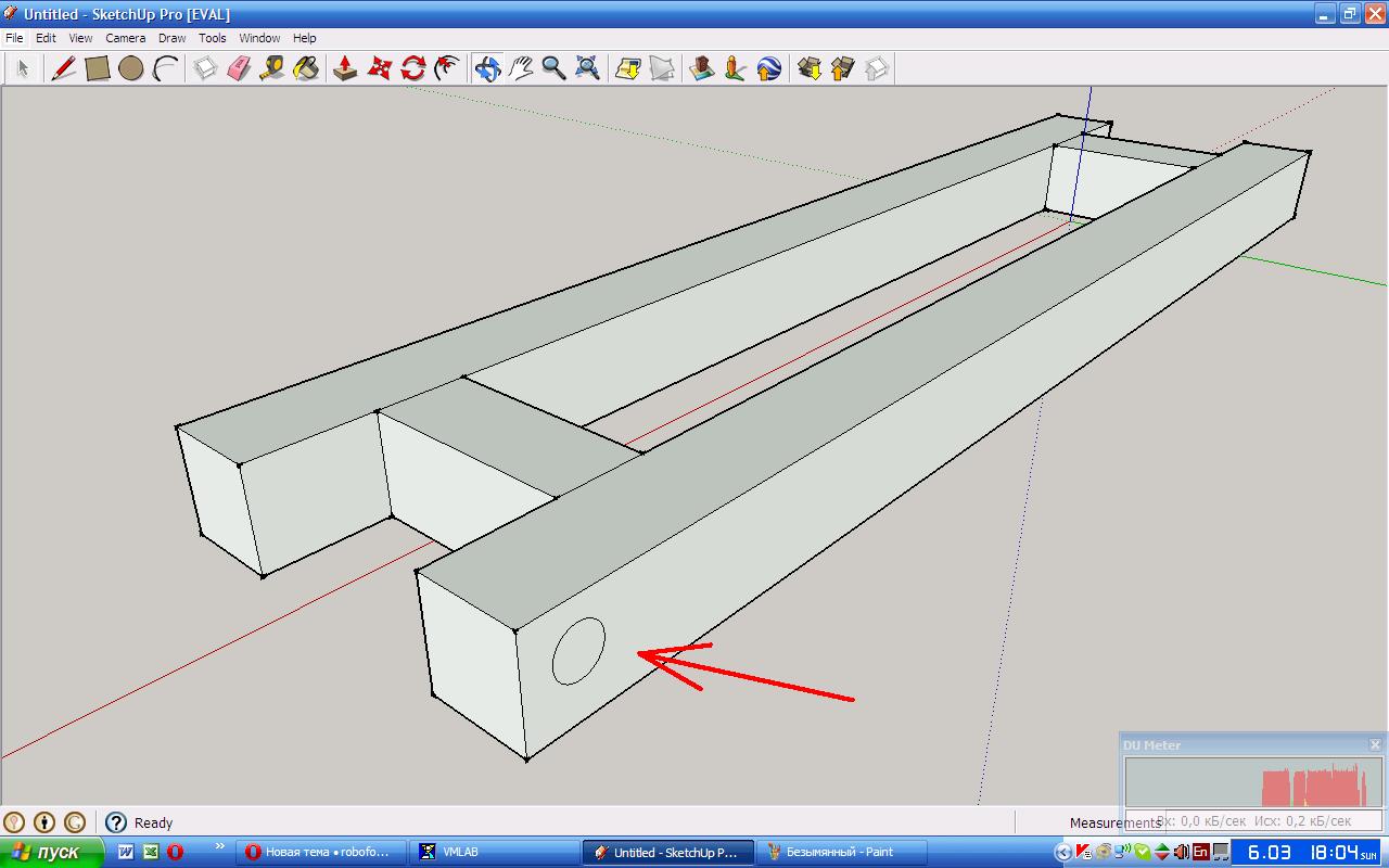 Я на шестом баловался. Попробуй эту окружность протащи сквозь модель, а потом потри лишние грани. Кнопка десятая слева. Или сделай отдельно штырь и пересеки его с заготовкой. В параметрах пересечения укажи, что нужно сопрягать с моделью, он в местах пересечения создаст линии. Потом основные линии штыря потереть, а те, что в месте пересечения - оставить. У меня получалось.