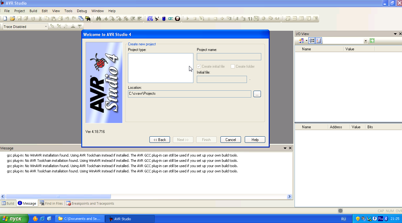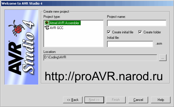 Установил AVR Studio 4.18, поставил SP1 и SP3. В окошке как на втором скрине у меня нет ни одного типа проекта, пожтому выбрать ничего нельзя, поэтому опять тупик. Сева внизу пишет версию 4.18.716 - может это важно...
