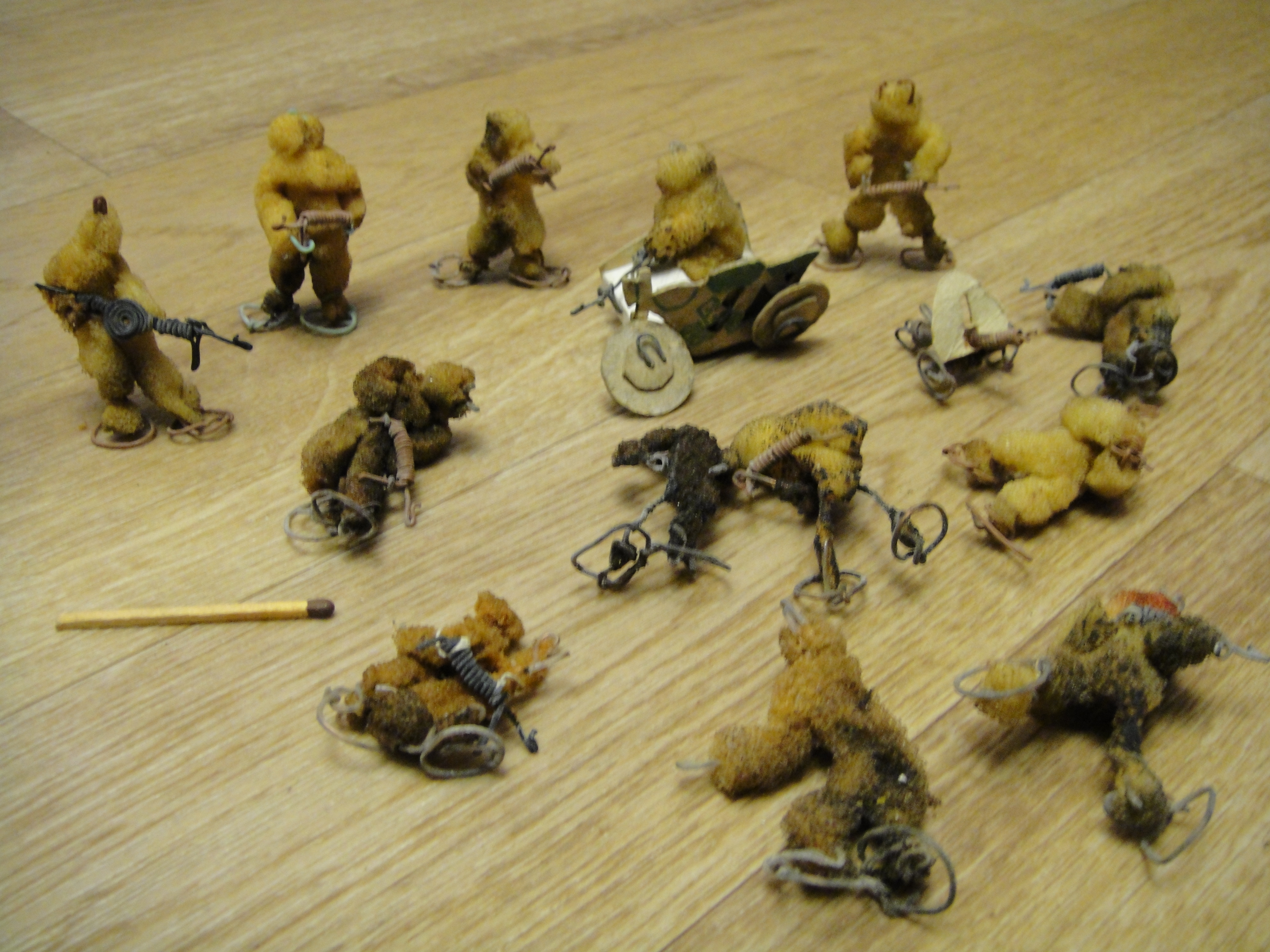 На солдатиков денег мне не выделяли, поэтому делал их себе сам из поролона, продевая внутрь проволоку. Их можно было ставить в любые позы иммитируя бой. Потом рядом с ними взрывался магниевый заряд и они весьма естественно обгорали, разлетались и принимали размазанные позы.