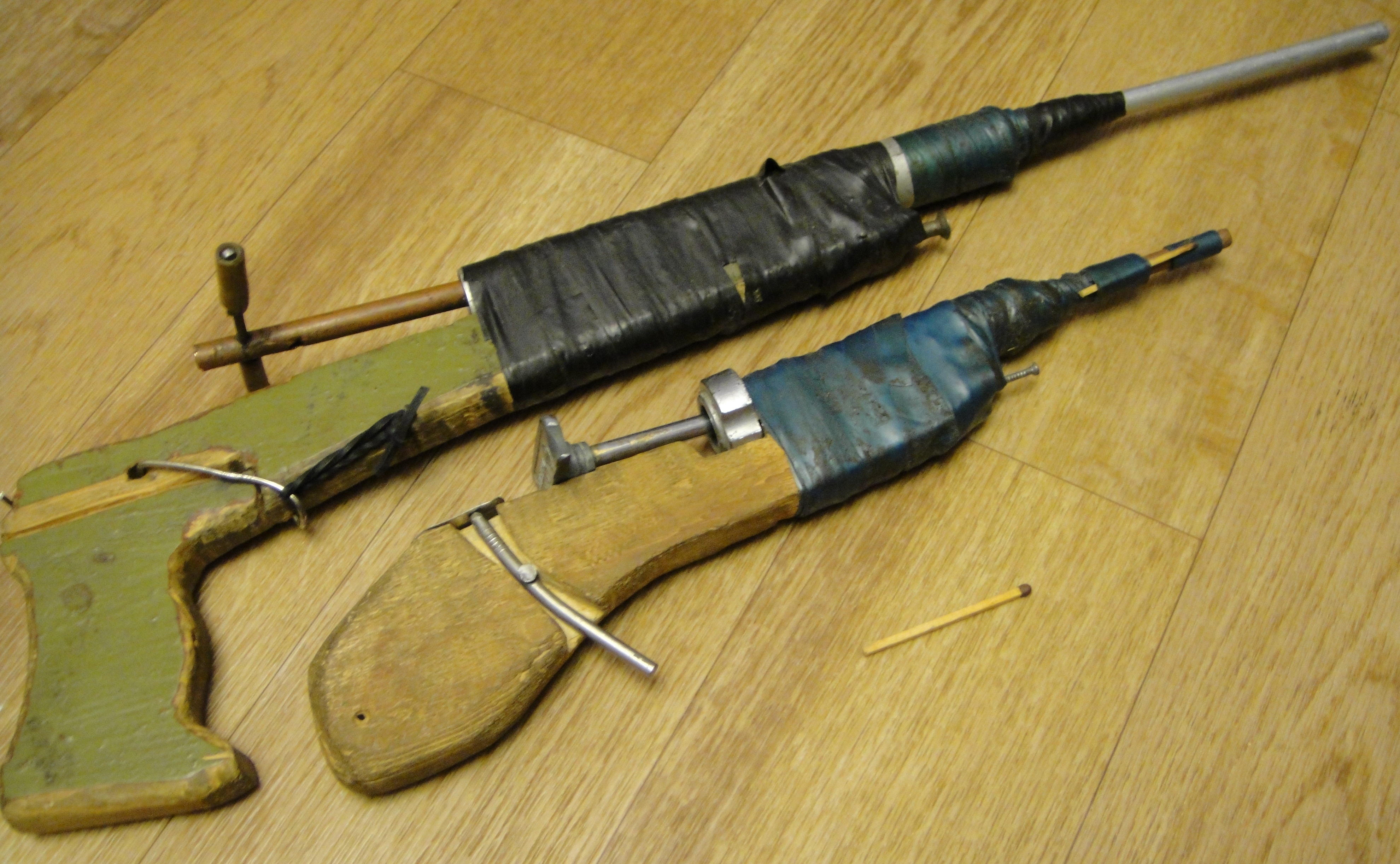 Сохранились два ружья из насосов из которых стреляли картошкой. Жгуты сгнили, а всё остальное в боевой готовности. Сколько же синяков девчонкам на попах наставили )) Как глаза не повыбивали - загадка.