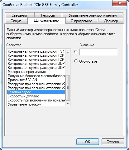 появится окошко, топаем на закладку "дополнительно", там будет список свойств. на различных сетевых название нужного пункта, да и вообще весь список может сильно отличаться. но эт не беда, если что нужный пункт можно найти просто перекликав все пункты. нужный будет выглядеть примерно таккогда нужно будет что бы сетевуха стала использовать зашитый в неё мак адрес, просто переключаешь обратно на "отсутствует". в то поле мак вводится без всяких пробелов и двоеточий, просто подряд все цифры и буквы. не помню, после этого нужно отключить и включить сетевуху или передёрнуть шнур, но на всякий можно.
