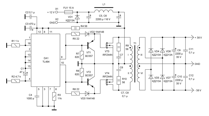 набери по входу 10000...20000мкф (ставь их после дросселя)С5, С6