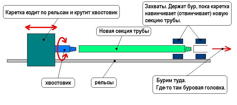 Когда каретка доезжает до конца рельса, она вывинчивается из бура, отъезжает вверх (налево на картинке), в установку подается очередная секция трубы. каретка навинчивается на нее и на остальной бур и процесс продолжается. Ну и вынимается бур в обратном порядке. Захваты держат трубы в процессе навинчивания-завинчивания.