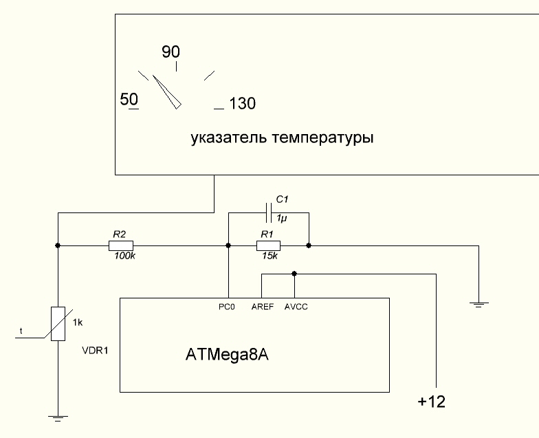 подключаю к этому терморезистору делитель напряжения и микроконтролер Atmega8, ADC считываю с порта 0 (PORTC0)