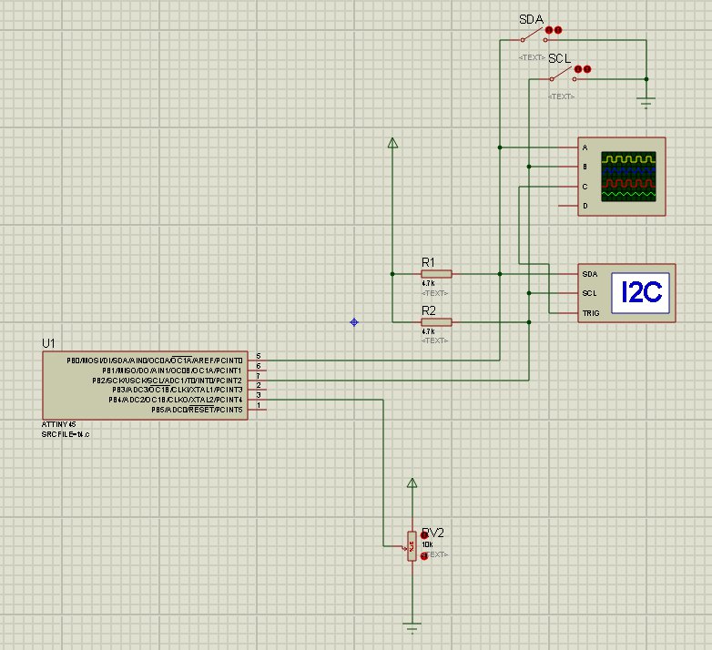Есть ATtiny45 по i2c к ней в Proteus подключен i2c debuger. SDA и SCL подтянуты на питание резисторами (параметр цифровой для резисторов выставлен).
