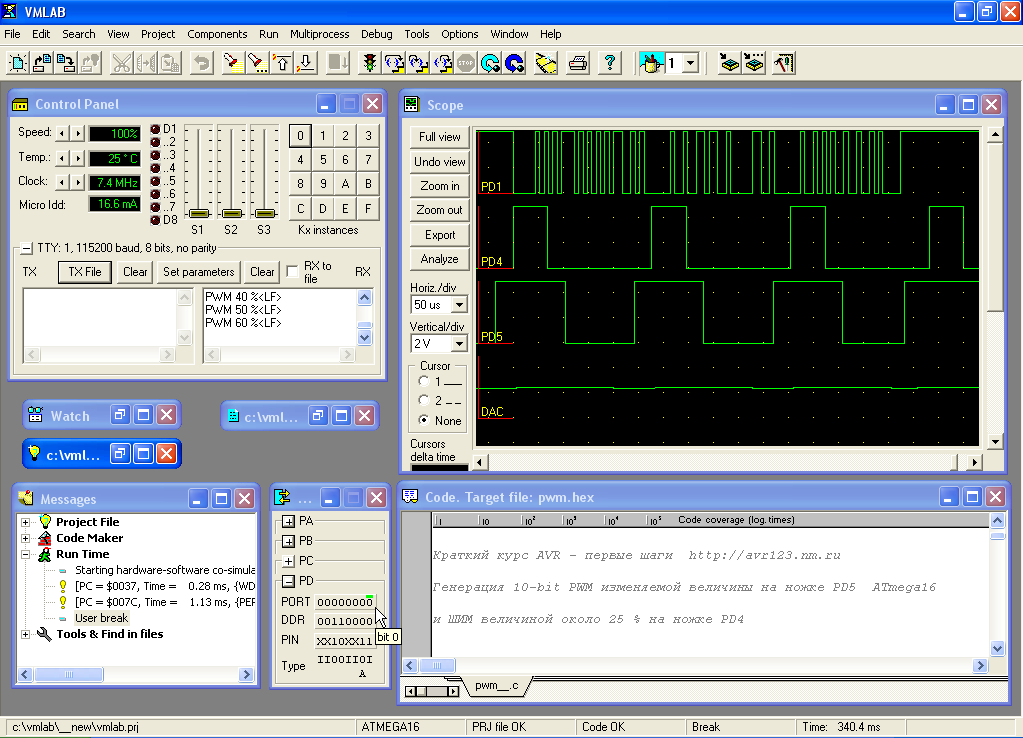 Я даже заподозрил, уж не трабл ли это VMLAB? Или у меня в ДНК что-то? Есть ли у кого простенький код, демонстрирующий работу ШИМ или работающий код для "музыкалки"?