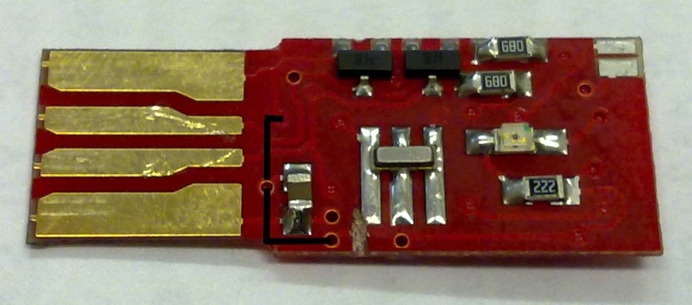 кварц припаян на 3 площадки, одна прощадка идёт к минусовому контакту усб и была перерезана.