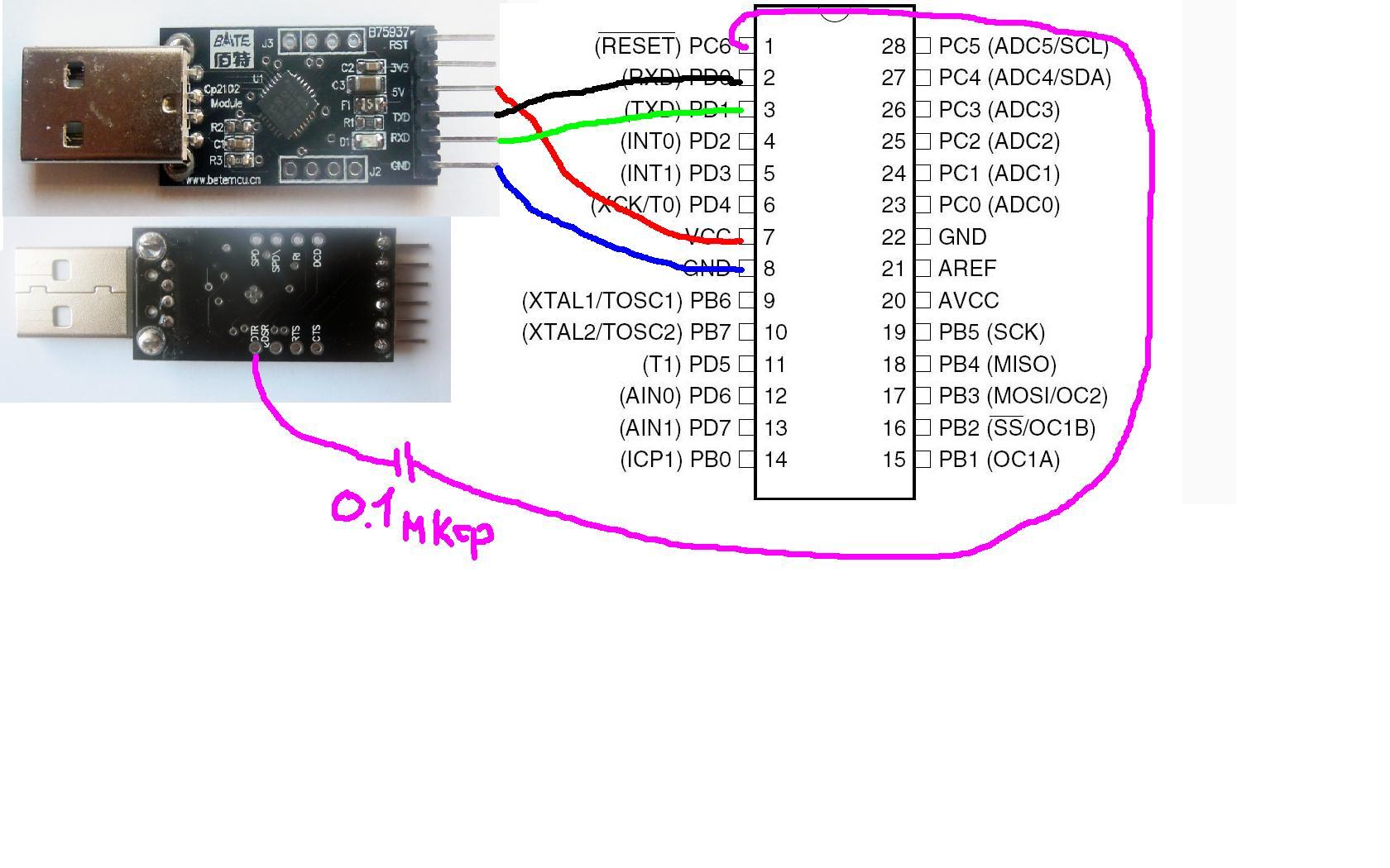 Не получается подключить атмегу8 к cp2102. Бутлоадер прошил из папки ... \arduino\arduino 0021\hardware\arduino\bootloaders\atmega8. Светодиод 13 мигает. Заливаю скетч, нажимаю монитор ком порта - инфомация от атмеги идет. Вынимаю МК из ардуины и напрямую поключаю к ср2102 - и ничего, в ком порте глухо (