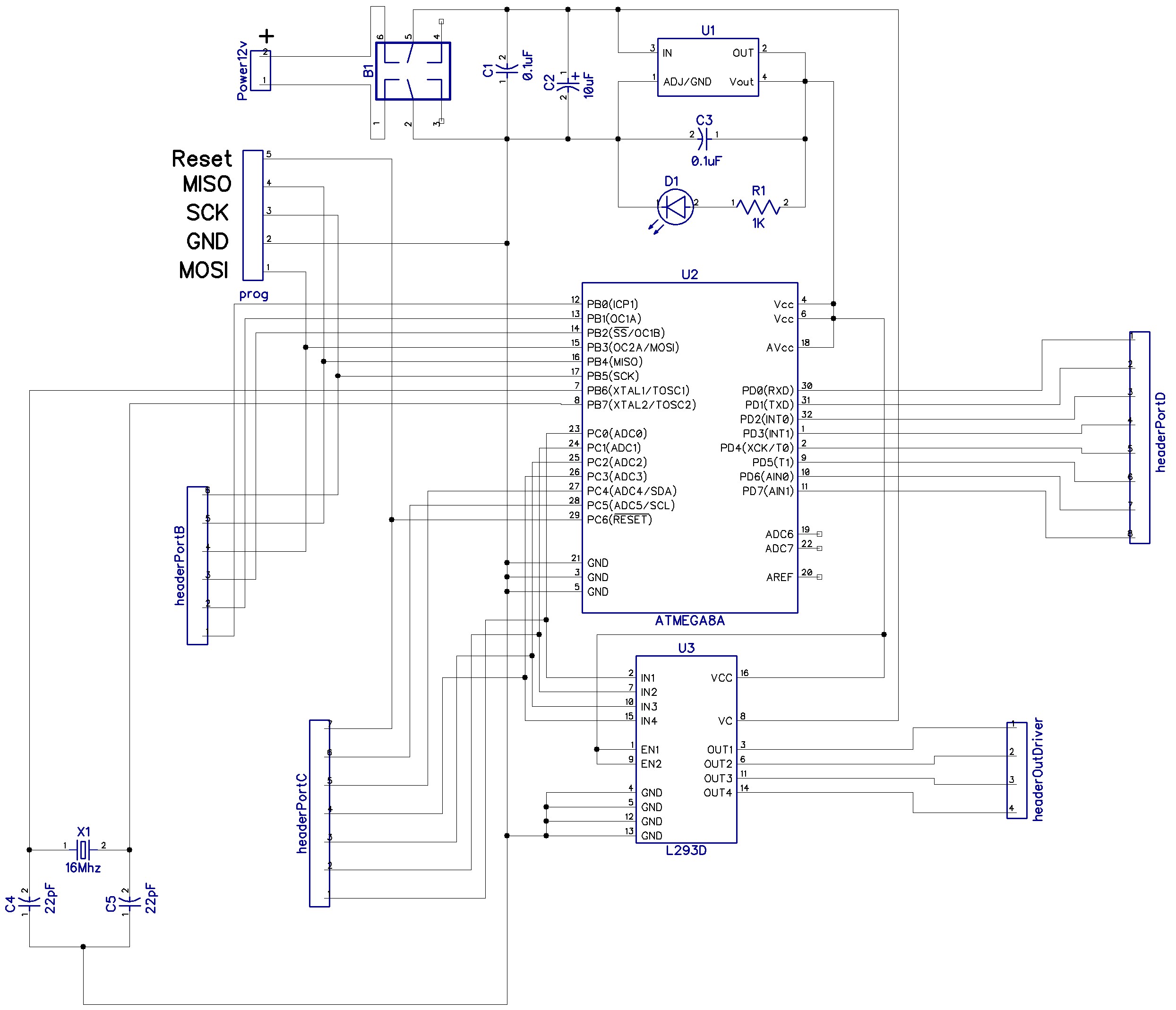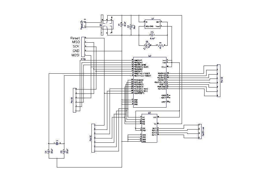 у меня стандартная ситуация, я как начинающий радиолюбитель прочитал кучу литературы. нарисовал схемку по логике все довольно просто. ATMega8A + L293D схемка во вложении, вытравил, напаял элементы, вообщем вопрос такой почему при подаче питания 5v на AVR, на портах при выводе получаю +5v, но с очень низкой силой тока, которой не хватает даже на светодиод(зеленый 3мм). Индикатор на плате такой же светодиод горит нормально.