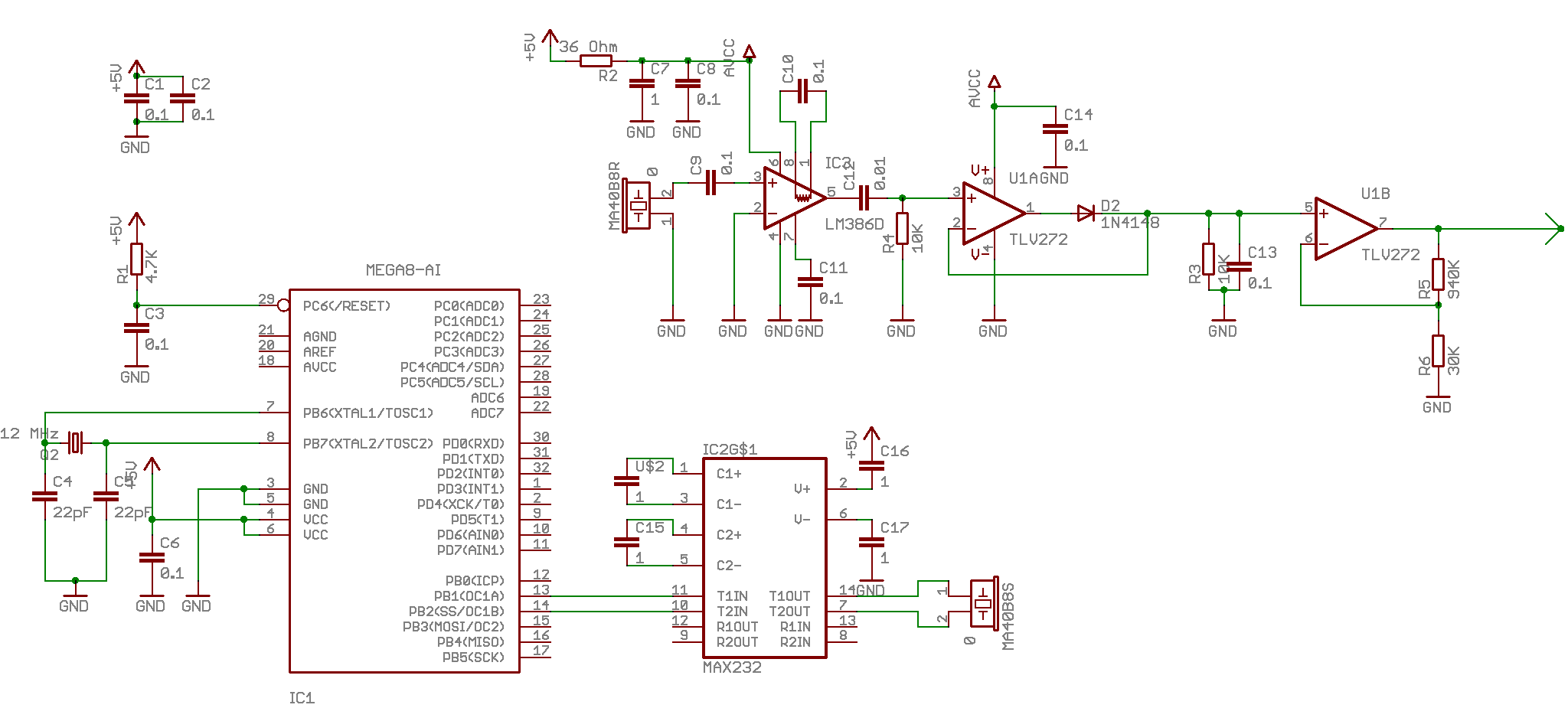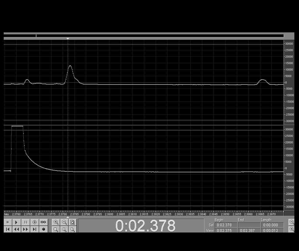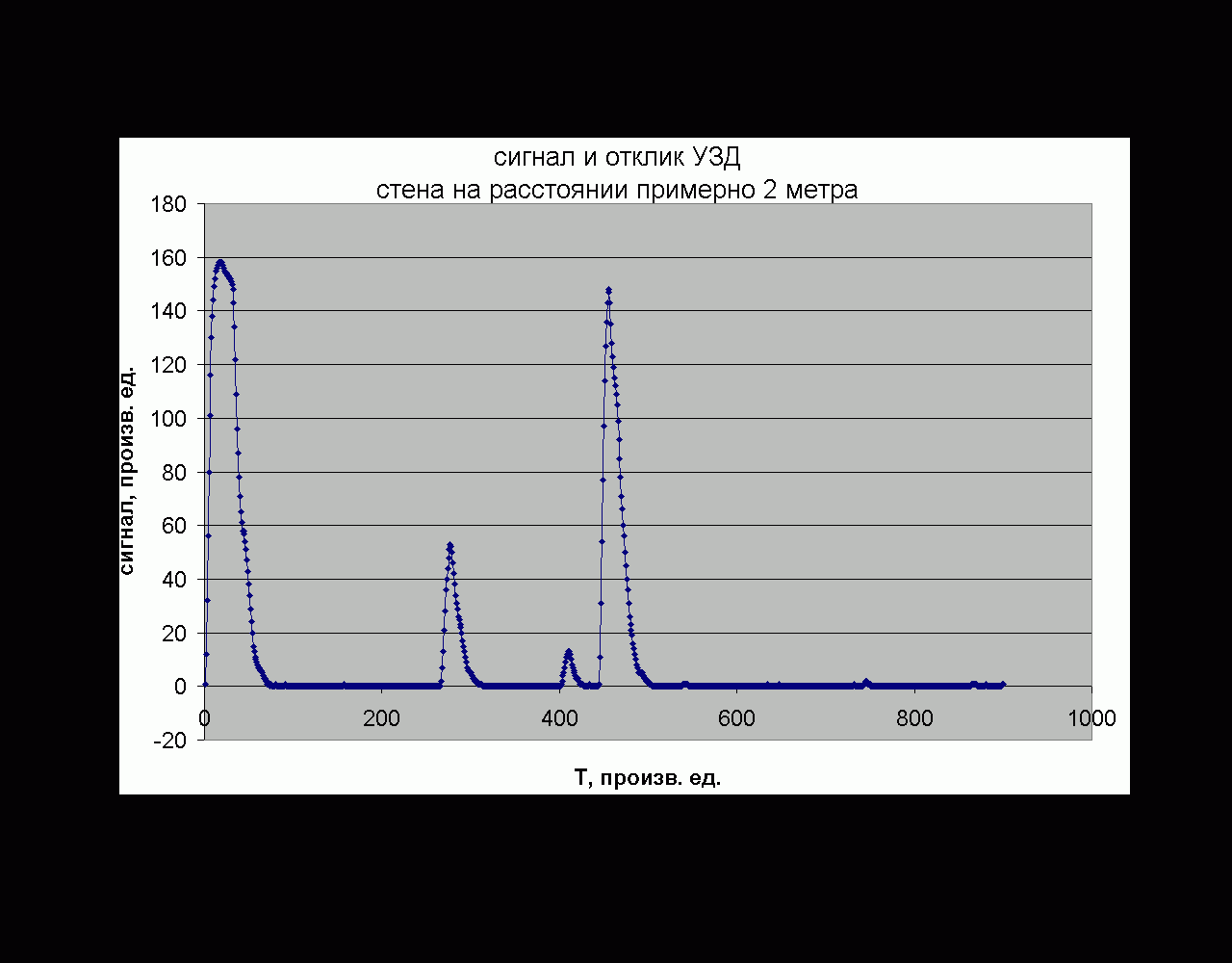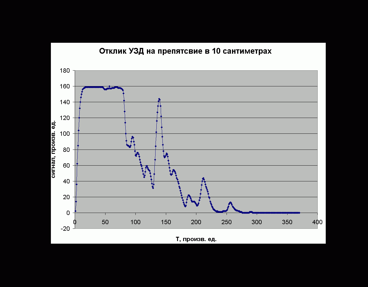 В общем, начал я разрождаться УЗ дальномером. Проанализировав имеющиеся данные, решил раскачивать излучатель МАКСом 232, а для передового усилителя взял монолитный усилок для наушников LM386. Ему не нужно двух полярное питание и смещение, обвязки минимум, низкие шумы. Усиление можно выставить от 50 до 200, на 50 полоса 300 КГц, на 200 порядка 40 КГц, по всем параметрам вполне удовлетворяет. Дальше воткнул пиковый детектор-выпрямитель на диодах Шоттки. Наверно из-за такого пассивного выпрямителя сигнал получился слабым, дальность порядка 2х метров по нормали. Ближний предел порядка 6-10 сантиметров. Пока не знаю, буду ли сразу ставить ОУ (он там нужен хотябы для АЦП) в не инвертирующем включении, так как от сильный всплесков с начала излучения он может начать насыщаться и давать жуткие затяжки по времени. Завтра измерю все нормальным скопом. Сейчас тестирую так- выдаю на выход 10 импульсов и засекаю их на одном канале звуковухи. На другом канале смотрю сигнал с выхода приемника.