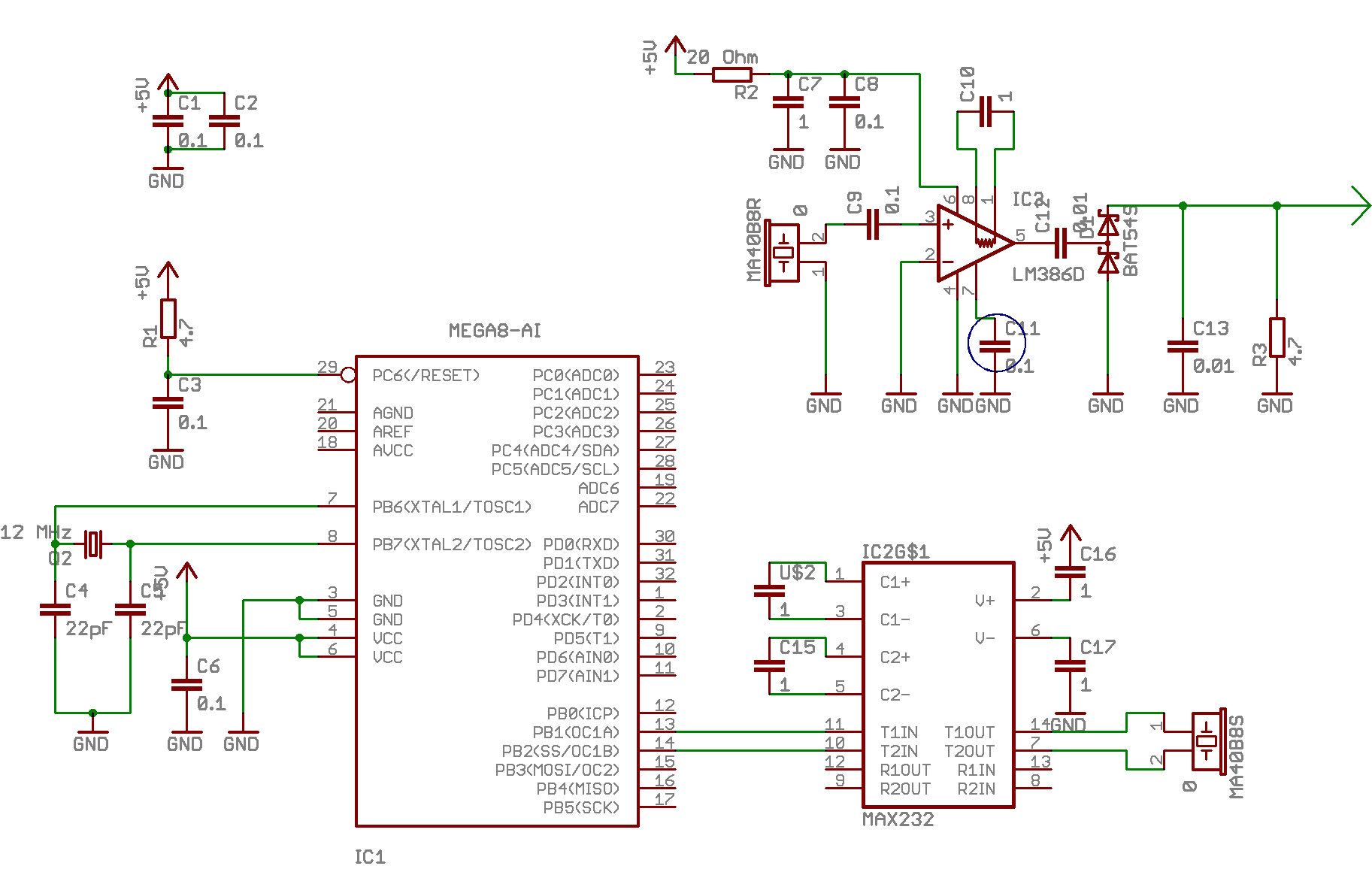 В общем, начал я разрождаться УЗ дальномером. Проанализировав имеющиеся данные, решил раскачивать излучатель МАКСом 232, а для передового усилителя взял монолитный усилок для наушников LM386. Ему не нужно двух полярное питание и смещение, обвязки минимум, низкие шумы. Усиление можно выставить от 50 до 200, на 50 полоса 300 КГц, на 200 порядка 40 КГц, по всем параметрам вполне удовлетворяет. Дальше воткнул пиковый детектор-выпрямитель на диодах Шоттки. Наверно из-за такого пассивного выпрямителя сигнал получился слабым, дальность порядка 2х метров по нормали. Ближний предел порядка 6-10 сантиметров. Пока не знаю, буду ли сразу ставить ОУ (он там нужен хотябы для АЦП) в не инвертирующем включении, так как от сильный всплесков с начала излучения он может начать насыщаться и давать жуткие затяжки по времени. Завтра измерю все нормальным скопом. Сейчас тестирую так- выдаю на выход 10 импульсов и засекаю их на одном канале звуковухи. На другом канале смотрю сигнал с выхода приемника.