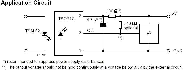Собственно говоря, схема не работает. Очень странно то, что на выходе ТСОПа напряжение 10 мВольт согласно китайскому мультиметру ( даже при его точности это не нуль), и меняется при подесении ИК диода ( примерно с 10 мВольт до 13 мВольт). Причем по даташиту нуль на выходе как раз и обозначает срабатывание, а у меня с точностью до наоборот- на выходе почти нуль. Подтяжка к питанию выхода ТСОПа сделана, и вывод настроен как вход ( при замыкании выхода ТСОПа и питания индикаторный диод мигает, то есть все остальное верно). Кто-нибудь раньше сталкивался с такими глюками? В чем тут может быть дело? Убирать 50-омный резистор, или вообще излучающий диод слаб? Или неправильно подобран сигнал ( 30 тактов частоты 36 КГц, 30 тактов такой же частоты с постоянной засветкой)? Или может играть роль то, что после последнего импульса в пачке ИК-диод может остаться включенным?