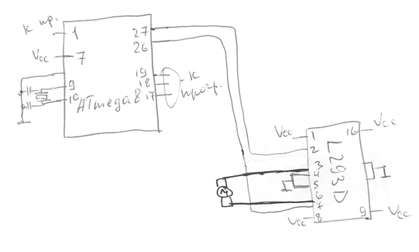 В общем собрал простую тестовую платку на ATmega8 и L293D+движок, прошиваю контроллер, но программа на нём выполняется, только если программатор подключён к контроллеру и к компьютеру...т.е. после прошивки мотор вращается (написал для начала программку, чтобы мотор попеременно вращался в разные стороны) как надо, отключаю программатор от контроллера - mega "виснет" (мотор вращается только в одну сторону), подключаю обратно - всё опять работает, тоже самое происходит, если отключаю программатор от компа...если отключить питание от схемы и отключить программатор, а затем опять подать питание на схему, то мотор вообще не вращается.
