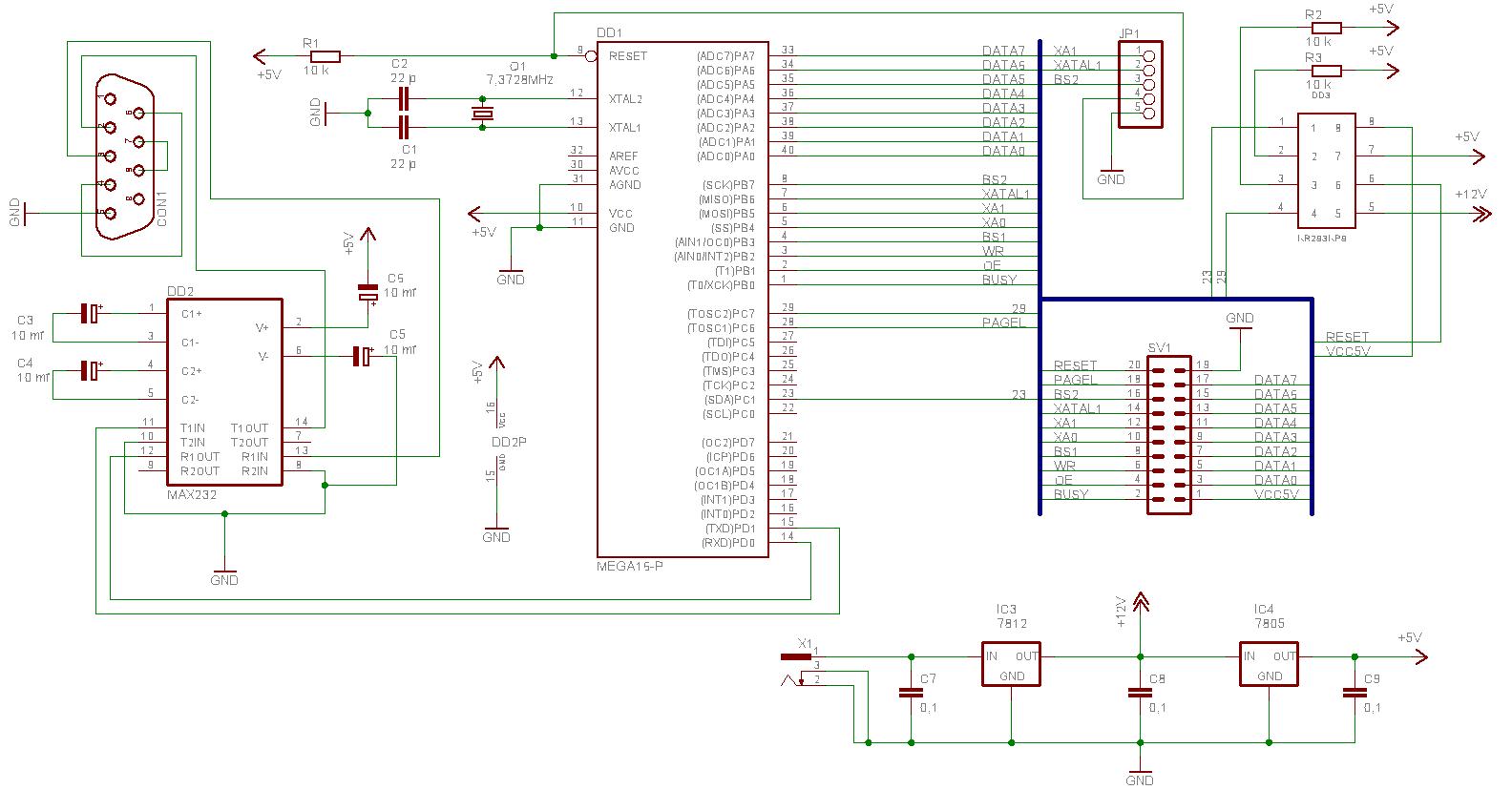 разводка платВот, решил собрать параллельный программатор (мегу фьюзами покалечил, не программиться через ISP) , нашел схему...подмывает, что там еще и JTAG есть сразу...