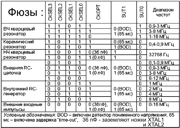 А вообще поработав пару лет с AVRами я уже по памяти фьюзы выставляю как надо. Только для всяких новый контроллеров в двтвшит лезу смотреть... Думаю никто не обидится если я сюда вот эту картинку из курса повешу. У меня она на работе на стенке висит. :wink: