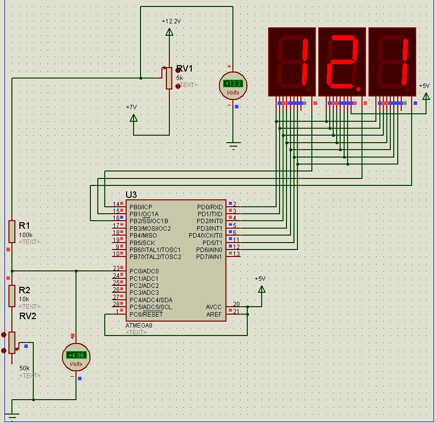 Вопщем если на индикаторы выводить просто показания adc_data, то все нормально, при напряжении 12,2 В, после делителя на вход АЦП приходит 4,06 В, что теоретически получается равным