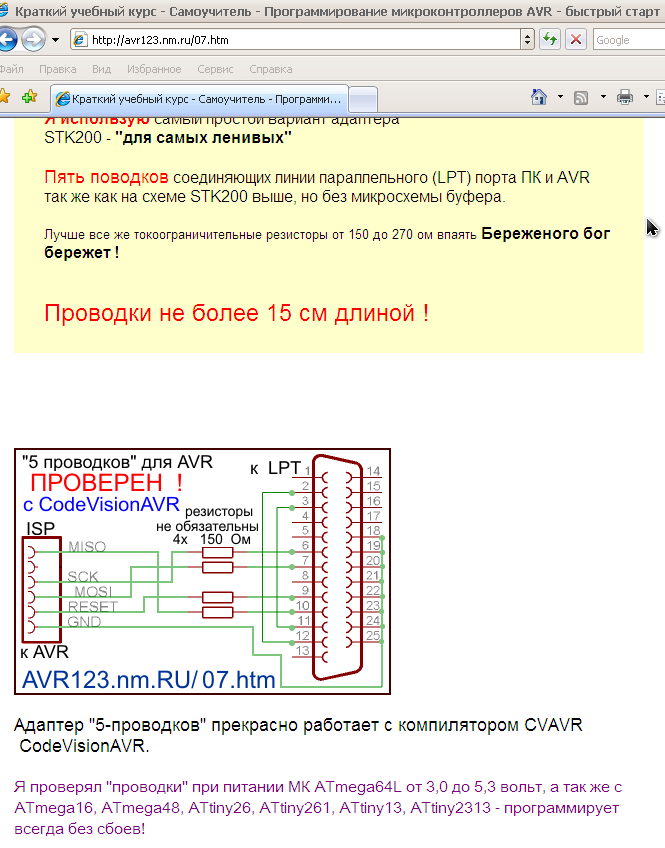 Нашел в интернете схему самого простого LPT программатора без буфера, просто 5 проводов.