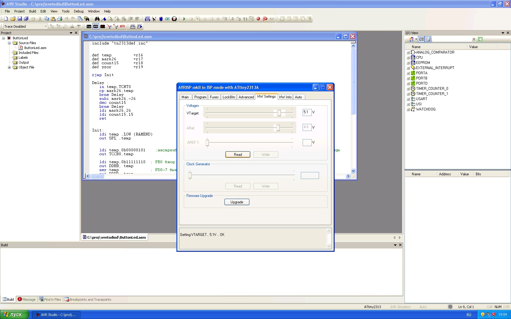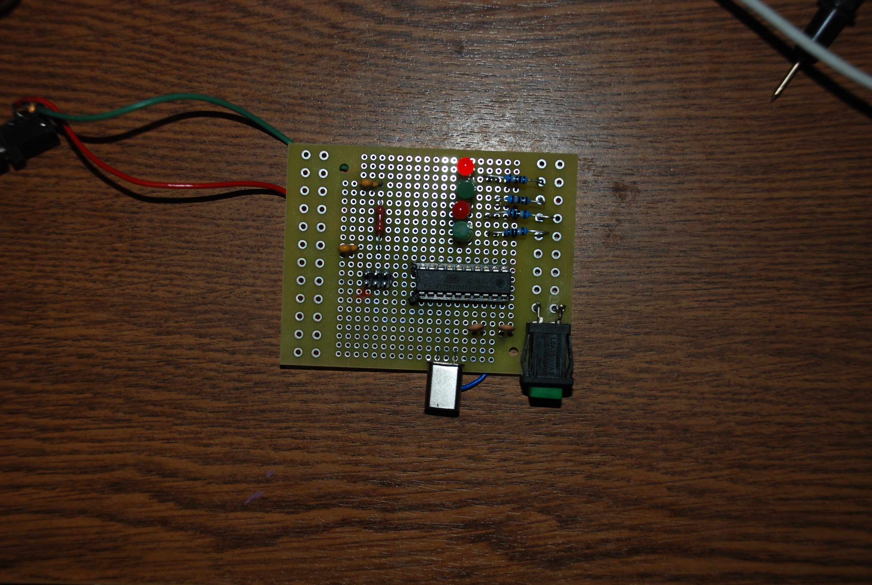 Я немного её изменил -добавил кнопку , между PB0 и землей.Программы залитые в мк работают черт де как,автор схемы грешит на то что я использовал нестабилизированный источник питания.