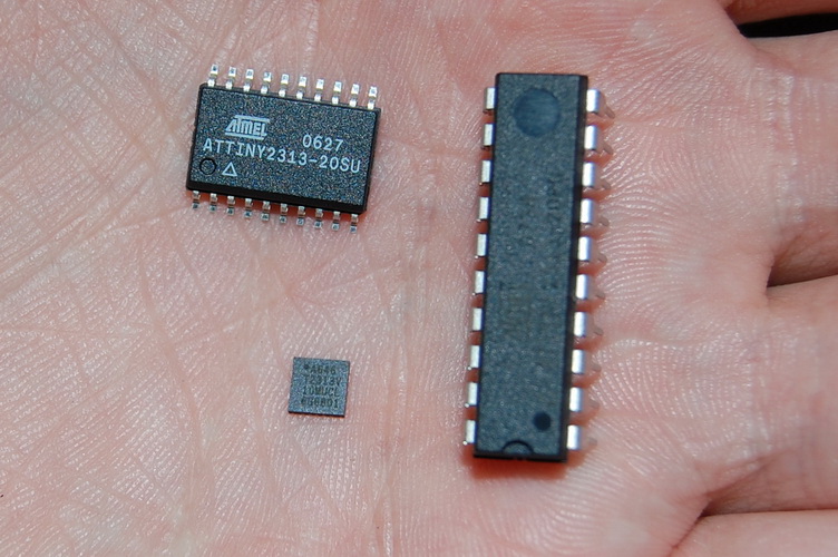 все три это тиньки 2313, преимущество использования более мелкой для миниатюризации очевидно. при уменьшении с 4*4 до 2*2 выйгрыша практичиски никакого (для плат лутом и пайке "на коленке"). ну так, чтоб представлять легче насколько такие размеры уже не дают особо выйгрыша - длина контактной дорожки к резюку 0201 и сам резюк будет примерно равна длине стороны чипа.Сейчас этот форум просматривают: нет зарегистрированных пользователей и гости: 0