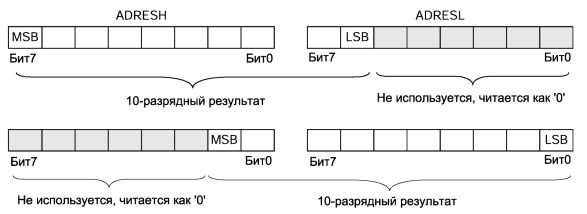 в твоем случае можно использовать только ADRESH - 8бит - разрешение получится 255 и не делать преобразование х=()+().