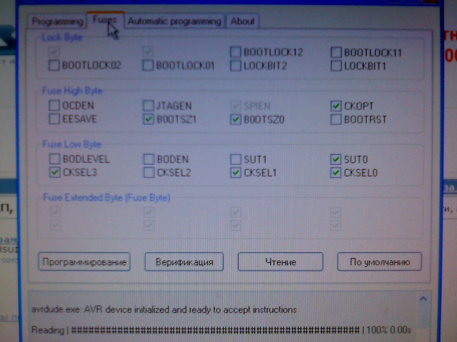 Остается только одно , неправильно поставленные fuse byte . Заливаю программу с помощью USBASP_AVRDUDE_PROG . Вот такие фьюзы выставляю :