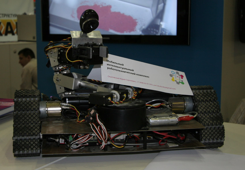 Ну и еще были роботы с УрГУ нашего местного - это к платформе от LynxMotion прикрутили манипулятор от LynxMotion и поставили ноутбук - зачем-то сделали это на стальных уже покрывающихся ржавчиной листах